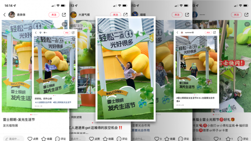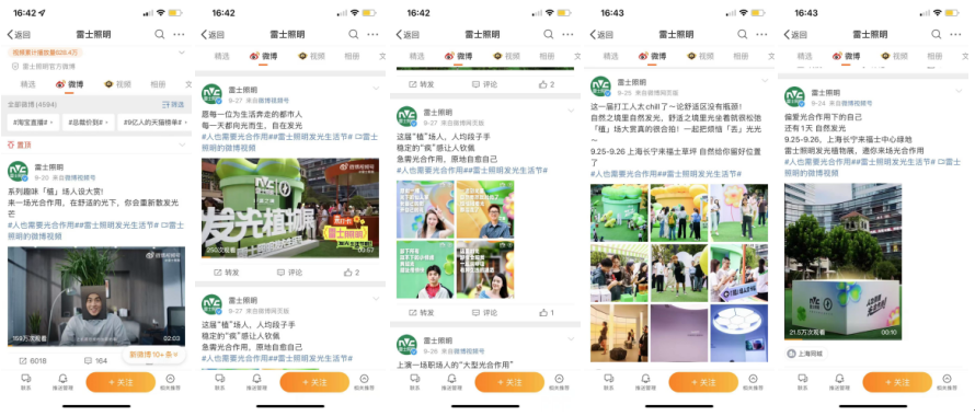 品牌官方平臺作為發聲主陣地,期間不間斷放送創意視頻、線下預告、直播回顧。產出眾多優質內容,不斷為品牌話題#雷士照明發光生活節##人也需要光合作用#輸出熱度。話題從微博熱搜延伸到抖音、小紅書等主流平臺,發光生活節相關內容,占據話題實時熱門內容首頁。其中兩大話題抖音總曝光量達350.6W+,558人參與。