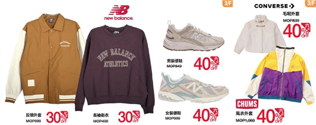 休閑服飾及戶外運動品牌,「新百倫」、「洽洽鳥」「匡威」及熱門馬丁靴品牌「馬丁大夫」等低至6折起!每天更有限量鞋款以超驚喜價開售!