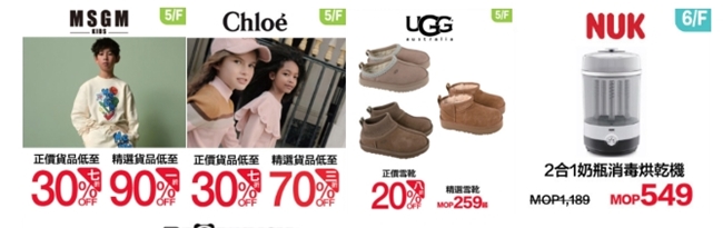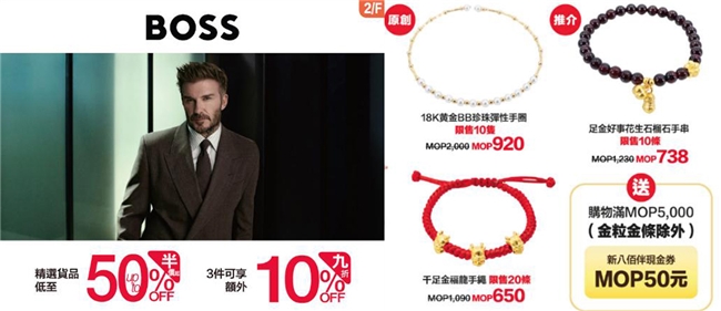多個男女時尚潮牌,「摩安珂」、「迪賽」及「雨果博斯」等特選商品低至1折起!不用千元就能購入千足金手繩,額外再返現澳門元50現金券購物賞上賞!