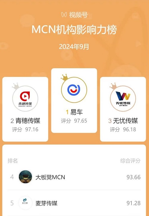 日前,視頻號官方發布9月“MCN機構影響力榜”,知名汽車互聯網平臺易車旗下短視頻MCN榮登榜首,成為視頻號領域最受關注的MCN之一。