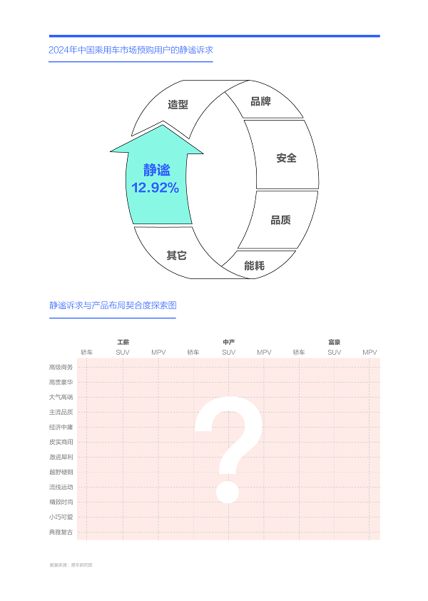 2024年中國購車用戶的靜謐訴求為12.92%,在整體排行中比較靠后,靜謐性的價值可能更聚焦于某個細分車市
