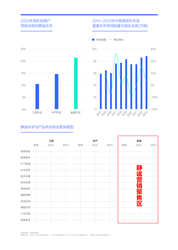 上述五大類型產品,不僅用戶的靜謐訴求突出,且富豪用戶占比顯著,理應成為致力于角逐富豪車市的車企營銷靜謐賣點的優質載體。