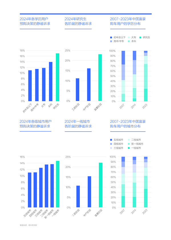 越有錢的用戶越想買輛安靜點的車子,尤其是高學歷富豪與大城富豪:2024年學歷越高的用戶,靜謐訴求越高,其中研究生逼近17%。如把研究生群體按收入進一步劃分,其中研究生富豪用戶的靜謐訴求更突出,2024年突破23%;2024年居住城市級別越大的用戶,靜謐訴求越高,其中北上廣深之四大一線城市逼近15%。如把一線城市購車群體按收入進一步劃分,其中一線城市富豪用戶的靜謐訴求更突出,2024年突破22%;