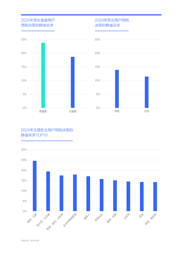 由于男富豪的靜謐訴求更突出,部分推高了那些易誕生男富豪職業的靜謐訴求,2024年律師和法務購車用戶的靜謐訴求高達24.59%,位居主流職業排行榜首,其次是設計師與藝術家,接近22%,顧問、分析師位居第三,接近20%,高管、媒體人、私營業主、科研、公務員、醫生等緊隨其后;