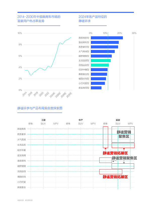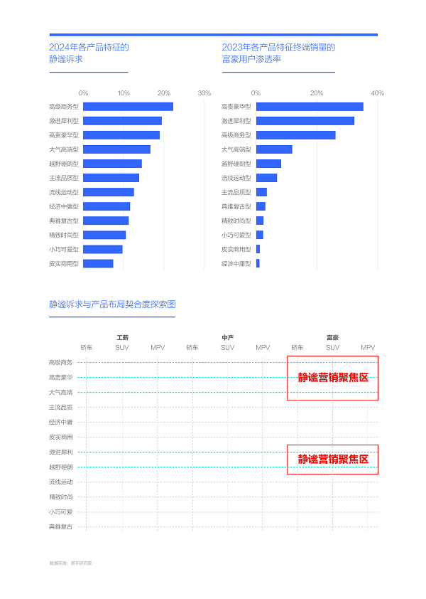 2024年富豪用戶的靜謐訴求達21.47%,比工薪高出一倍,且富豪車市蓬勃發展,理應成為車企靜謐營銷的關鍵細分車市。為提升富豪靜謐營銷的效率,可進一步聚焦“男富豪”,鎖定律師、顧問、高管等宜誕生男富豪的職業。從具體產品看,車企的靜謐營銷可聚焦高級商務、激進犀利、高貴豪華、大氣高端與越野硬朗等富豪占比突出的產品,可重點挖掘大節能MPV與SUV的靜謐賣點;