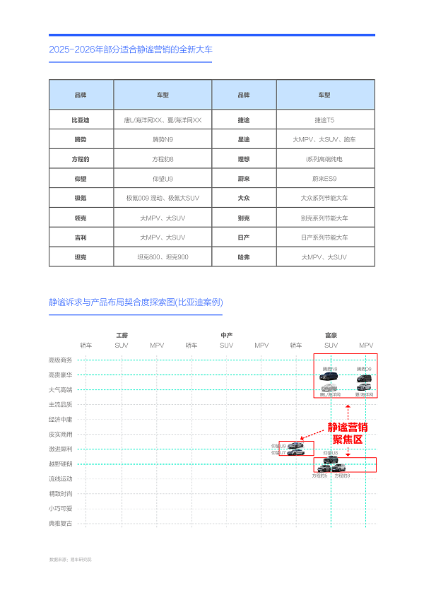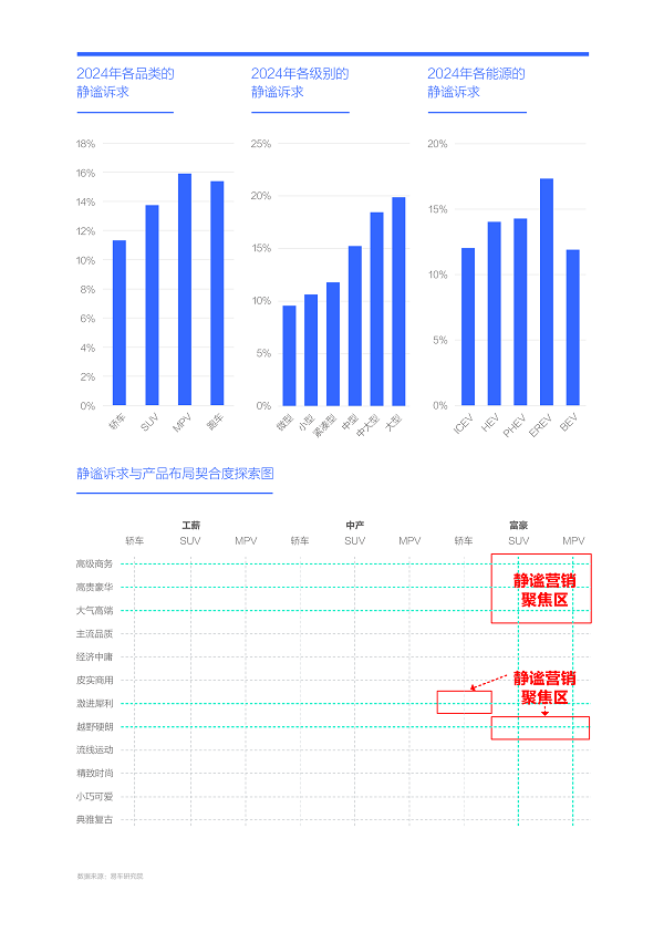 圍繞富豪的靜謐訴求,從品類、級別與能源切入,車企可重點挖掘大節能MPV與SUV的靜謐賣點