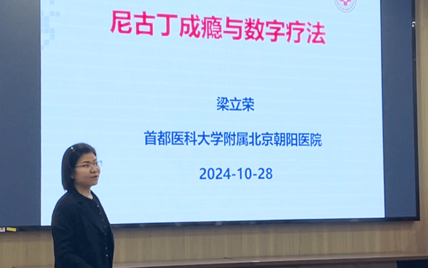 研討環節中,北京朝陽醫院臨床流行病學研究室及煙草依賴治療研究室主任、北京朝陽醫院戒煙門診負責人梁立榮圍繞“尼古丁成癮與數字療法”主題,從尼古丁成癮機制與干預策略、數字戒煙干預模式構建、數字控煙設備、控-戒干預模式四個方面進行了分享。