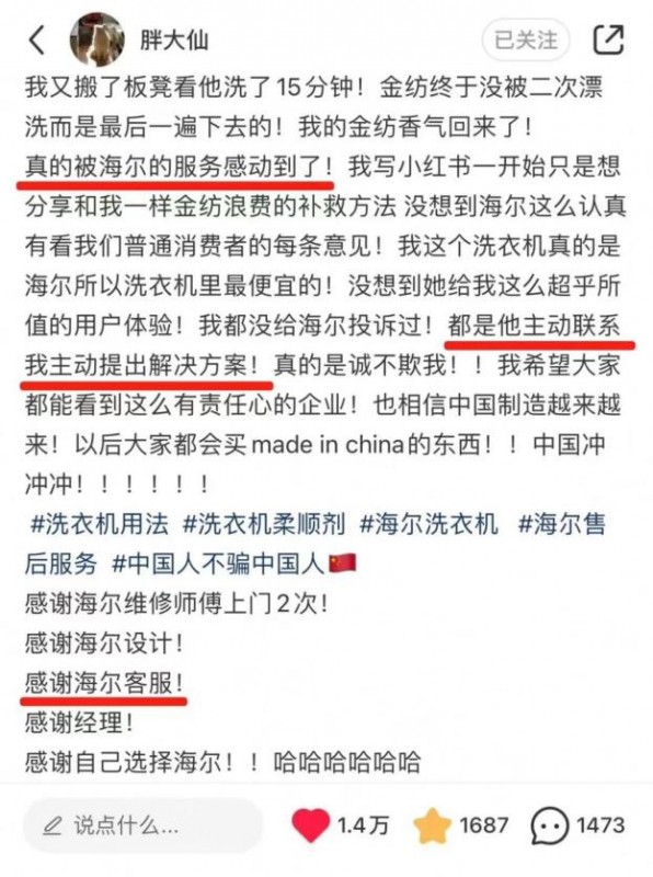 原來,龐女士在一次機洗衣物時發現,金紡柔順劑在洗滌階段就被水沖走,香味無法留存,便在網上發帖吐槽。海爾客服監測到這一需求后,立即主動聯系了她。