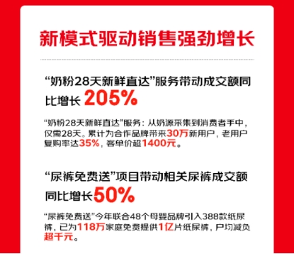 此外,京東超市推出的“尿褲尺碼隨心換”服務,目前已覆蓋京東超市全部尿褲商品,為超3000萬用戶解決尺碼不合適的問題,進一步為家庭育兒降成本。