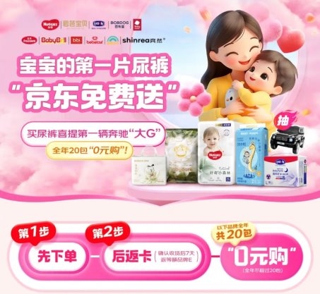 在尿褲免費送公益活動會場,下單參與活動的尿褲商品,在確認收貨7天后,就可以返還與下單實付金額等值的京東品牌E卡,每位用戶全年可免費領取20包尿褲,平均為每戶家庭降低超千元育兒成本。