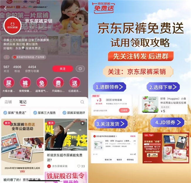 同時,參與“京東尿褲采銷”小紅書賬號發起的小紅書種草、群試用裝派發等線上互動活動,同樣可以獲得更多免費送機會。用戶關注京東尿褲采銷后,可進群領券,下單并發貨后,還送尿褲優惠券。