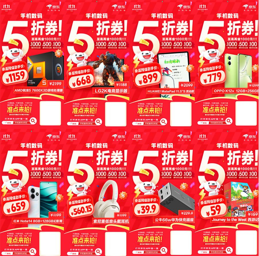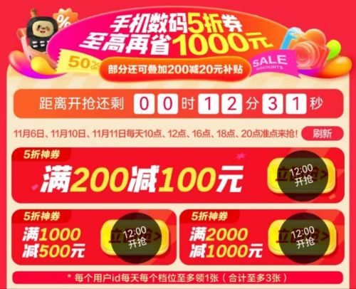 具體而言,京東11.11的5折優惠券活動將于11月6日、10日、11日開啟,并于每天的10點、12點、16點、18點、20點準時發放,打開京東APP搜“手機數碼5折起”即可進入活動會場首屏搶券。京東提供了滿200減100元、滿1000減500元、滿2000減1000元三檔5折神券,每個用戶每天每檔至多領1張,合計至多3張,下單3C數碼產品更劃算。沒搶到的朋友還可以關注京東3C數碼采銷直播間,在相同的日期每天20點、21點、22點左右也會發放一波5折券。此外部分產品不但能使用5折神券,還能再疊加滿200減20元的補貼,輕松獲得“又便宜又好”的購物體驗。