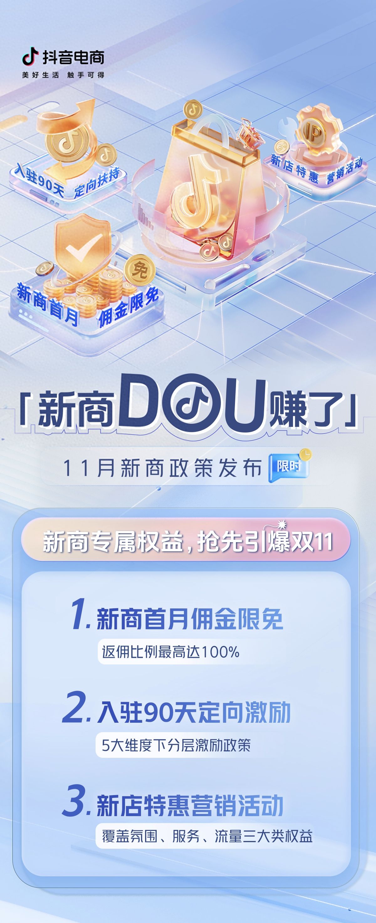 賺錢嘛,就得賺“熱乎”的,一年到頭消費者們也就這么狂歡一兩次,誰不想小店開張就趕上這么一個檔口呢?前兩天,斯基看到抖音電商發布了一個叫“新商DOU賺了”的針對新商扶持的專屬IP,里面攏共三條核心舉措,全都是沖著新手商家去的。