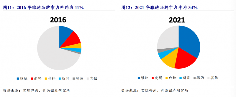 而從市場數據可以看到,無論是在行業高速發展期還是有限的增量環境下,雅迪跨越每個行業階段,份額都保持著增長姿態。市占率從2013年不到10%,到2016年約11%,再到現在突破30%。