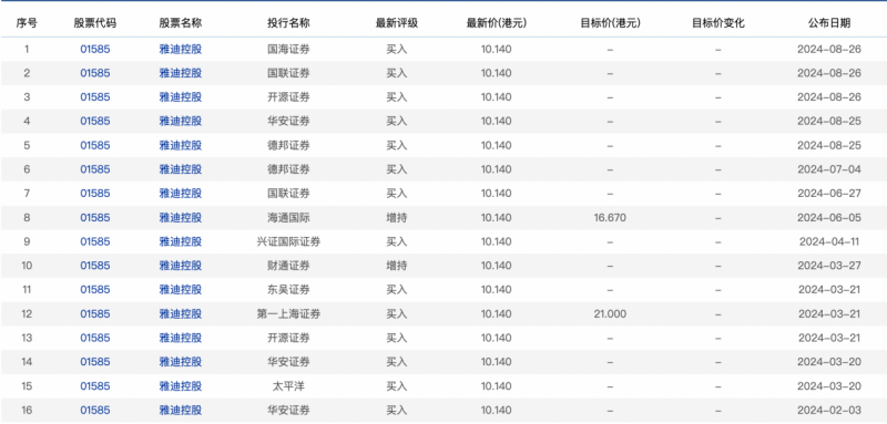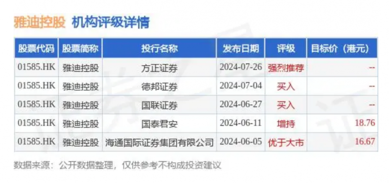 今年以來,雅迪的價值潛力備受專業機構認可。交銀國際在研報中指出,看好產業鏈中游的電動兩輪車制造商,最直接受益于電動兩輪車的需求增長。方正證券升雅迪控股評級至“強烈推薦”評級,德邦證券首次覆蓋給予“買入”評級,國泰君安首予“增持”評級。
