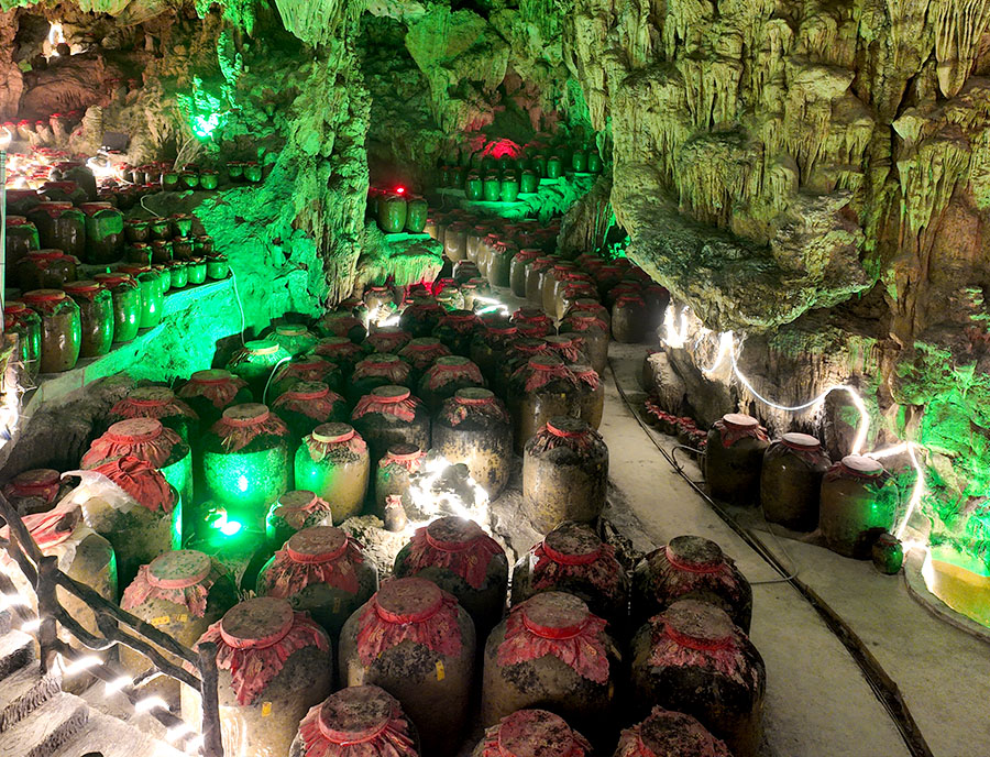 深秋季節,我們一行來到這條被成為亞洲第一世界第六的地下暗河。在群山環繞的廣西馬山里,這條暗河發源于云貴高原,不知地下是怎樣一種走勢,到了馬山周鹿鎮一帶,暗河出了地面,那奔流不息的河水在地上運行幾十米,而后又入地流淌。于是人們才知道,這方土地之下,居然有一條千古以來晝夜奔流不息的暗河。不知何年何月,人們驚奇發現,這條水系之水,居然含有大量對人體有益的多種礦物質的高級別的優質水,有人拿去與號稱為長壽之水的巴馬水對比,居然與巴馬是一模一樣的優質水。于是改革開放后,有人便取之做酒,然后在就近溶洞窖藏。于是,在巨大無比的溶洞之下,便是奔流的玄河,玄河上方,便是釀酒的窖池,從玄河取出天然泉水,在酒莊開始釀制米酒,經過無數道工藝之后,酒釀制好了,便灌入溶洞內放置好的大酒缸內,等它發酵變性,封缸窖藏。筆者有幸進洞參觀,那些長著厚厚一層雪霜的酒缸,個個訴說著無限秘密。