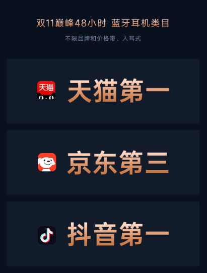 在此前為期半月的“雙十一”開門紅周期中,訊飛AI會議耳機就一直在各大電商平臺的AI耳機榜上名列榜首,甚至在京東AI耳機TOP10榜單中幾近“屠榜”,市場競爭力可見一斑。而步入“雙十一”終極沖刺的巔峰48小時,其不僅在AI耳機品類中繼續占據頂流席位,更在入耳式藍牙耳機大類目中大放異彩:不限價格區間、無論品牌背景,訊飛AI會議耳機在天貓與抖音的入耳式藍牙耳機銷售榜單上均成功登頂,同時在京東也獲得了第三名的佳績,展現了其突破細分市場的廣泛影響力。