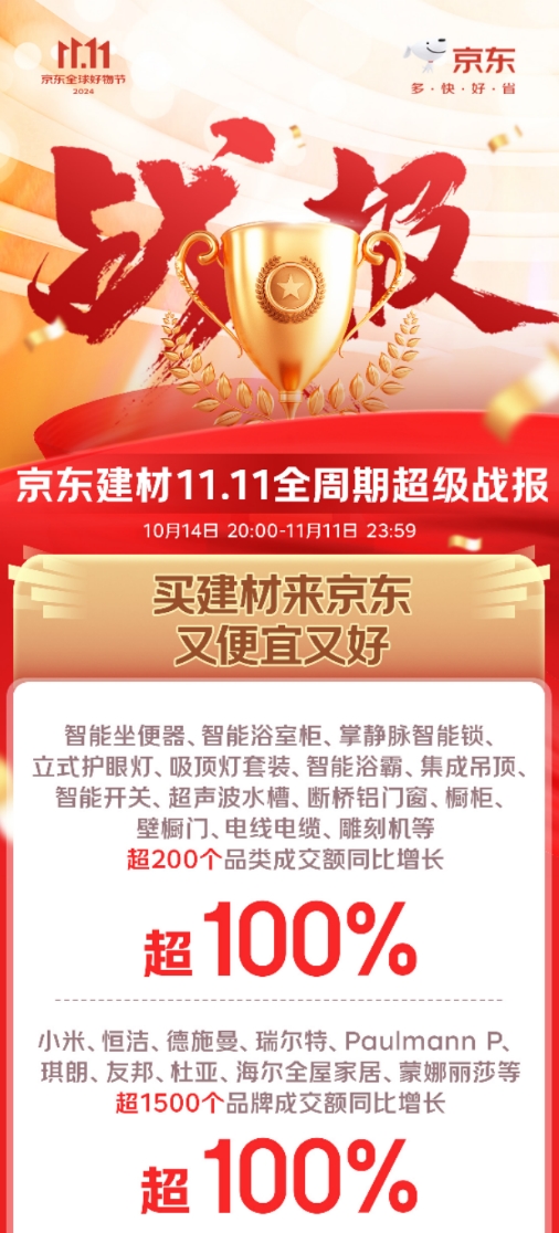 截至11月11日23:59,2024年京東11.11購物用戶數同比增長超20%,京東采銷直播訂單量同比增長3.8倍。超17000個品牌成交額同比增長超5倍,超30000個中小商家成交額同比增長超2倍。在這個又便宜又好的京東11.11,千家萬戶舊貌換新顏,京東建材也將持續攜手合作伙伴,以更高性價比的產品和更優的服務打造超預期消費體驗,讓更多家庭輕松煥新理想生活。