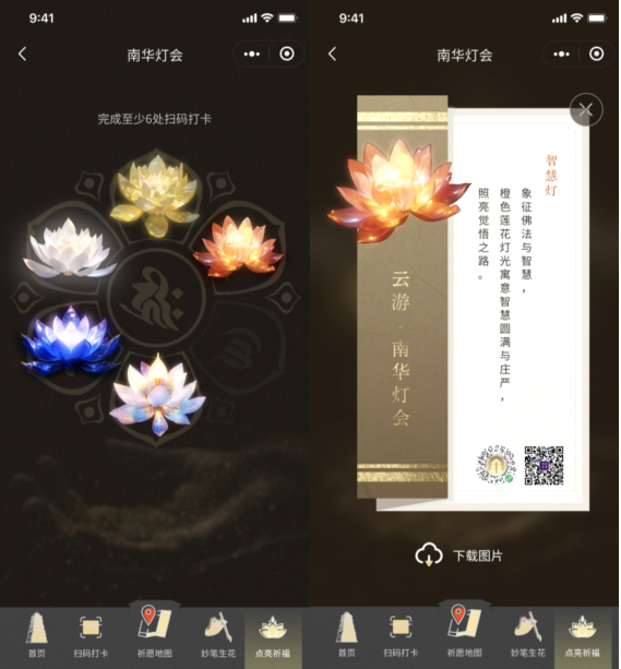 其中云游燈會采用全景AR技術,對燈會現場進行360度掃描,方便網友沉浸式在線觀燈的同時也能作為線下觀展的地圖導覽,此外,點擊燈組還有闡釋涵義的文字介紹,閱覽生動的禪宗典故與文人故事。祈愿地圖是線上互動功能,海內外網友可以代表自己的家鄉一鍵為祖國及家人祈福,充分滿足人們對美好生活的向往。掃碼打卡需要游客線下掃描指定燈組前的二維碼完成打卡動作,集齊6處即可隨機收到一盞祈愿花燈,祈愿花燈根據佛教典故分為藍、黃、白、紅、橙和五色混合色六種,不同顏色的花燈對應不同寓意與祝福。妙筆生花則是線下拍照能生成南華燈會的游覽卡片,滿足游客們游玩時的分享需求。