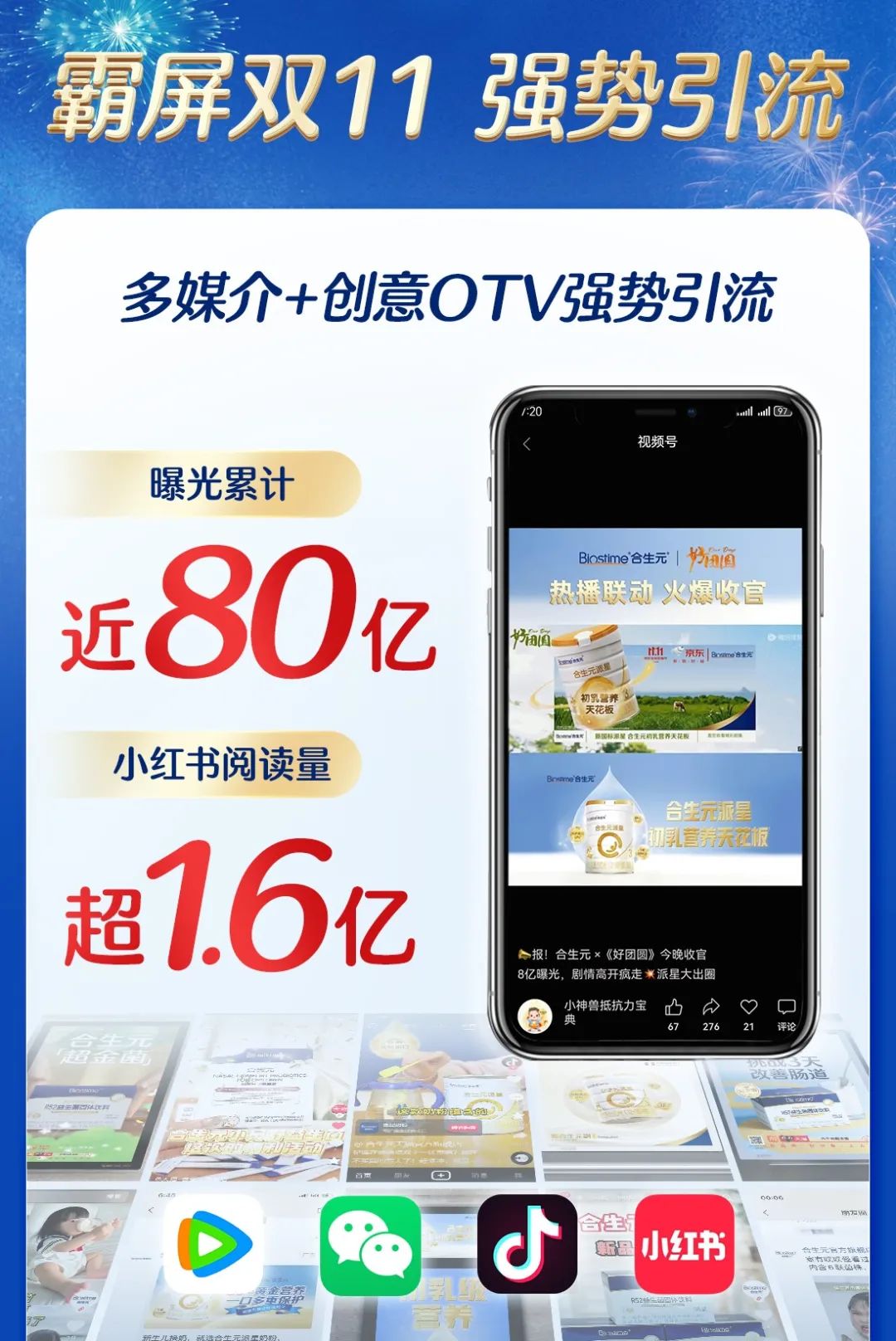 合生元聚焦多元化營銷策略及社交媒體玩法,攜手頭部育兒博主“年糕媽媽”在抖音直播間分享如何“自在當媽”;還聯合多位育兒專家在天貓直播間科普育兒,新客銷售額同比增長109%,實現強力拉新;同時,合生元聯動京東寵粉日開展直播,鎖定新生代母嬰群體,引爆電商平臺聲量。此外,合生元通過多媒體+創意OTV霸榜雙十一,累計曝光近80億,在與消費者的多元互動中收獲全網流量。