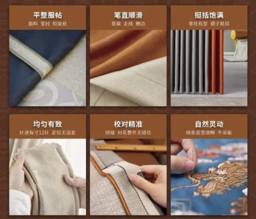 除了顏色風格的選擇,臥室窗簾的質感也很重要。一方面要選擇高克重高密度的窗簾,整體手感更扎實,垂感和遮光效果也更好;另一方面在走線封邊等細節上也要仔細觀察,走線整齊線頭少的更精致,質感更好。像高端窗簾定制品牌如魚得水,窗簾選材都是高密度高克重的布料,在窗簾工藝上更是采用313道西裝工藝,縫線邊距都是精確到毫厘之間,整體精致度更高,視覺效果更好也更耐用。