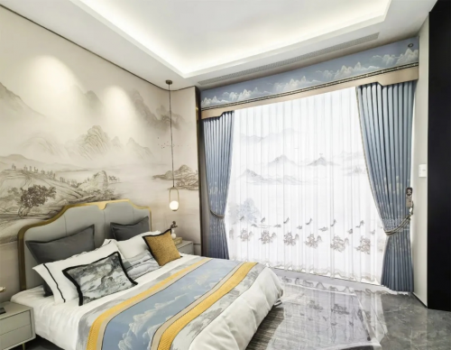 新中式風:新中式風追求古典與現代的結合,強調一種寧靜治愈的氛圍感。色彩上追求素雅簡約的搭配,但同時也強調中國傳統文化的融入。可以參考如魚得水新中式窗簾依山傍水系列,將山水文化融入到了窗簾設計之中,在中國文化中山和水具有非常重要的象征意義。山代表穩定和長壽,水代表財富和涼爽,亦有永恒繁榮之意。本款產品以灰藍色為底色,銀灰色的山巒層層疊疊,山巒中的人家依山傍水而建,悠閑自在,形成水天一色的美麗畫卷。將中式元素與現代材質巧妙兼柔,營造出具有東方雅韻的詩意美。
