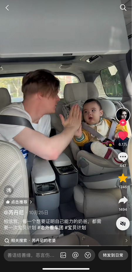 如今很多中國品牌汽車常見的車內通風、空氣凈化系統以及后排娛樂大屏的功能,都為芮丹尼帶娃提供了助力。母嬰級環保材質、超大車內空間,也讓有娃的家庭出行更方便、安心。一串amazing后,外國友人也被中國汽車驚艷到了,足以看出他們對中國汽車的關注和喜愛。