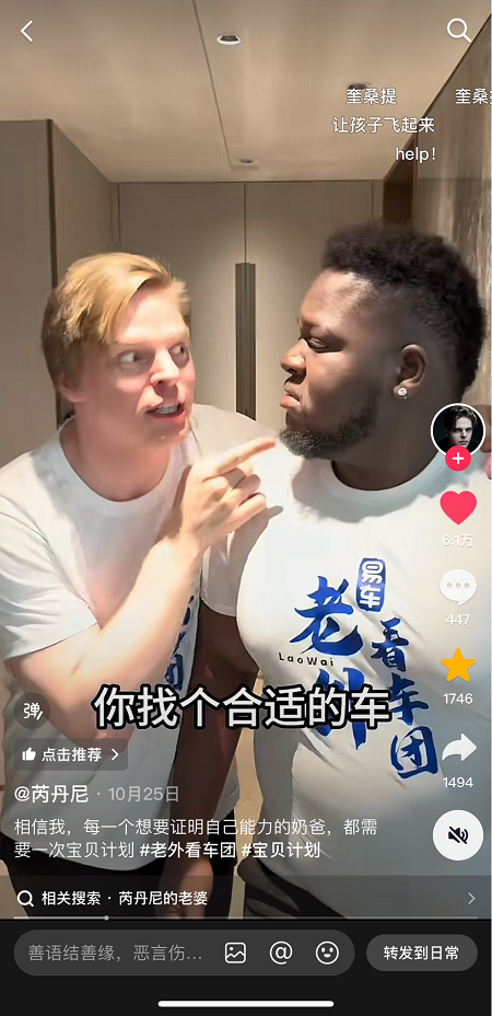 在中國發展的拉脫維亞電影演員芮丹尼就是其中的一員。芮丹尼不僅坐擁1400w+抖音粉絲,講一口流利的中文,有一位中國妻子,還參演了眾多中國電影,被稱為是“中國通”。 近期,芮丹尼帶著自己的朋友參加了易車發起的“老外看車團”活動,通過鏡頭展示了奶爸帶娃的一天,以及兩個“歪果仁”如何被中國智能汽車硬控的一天。