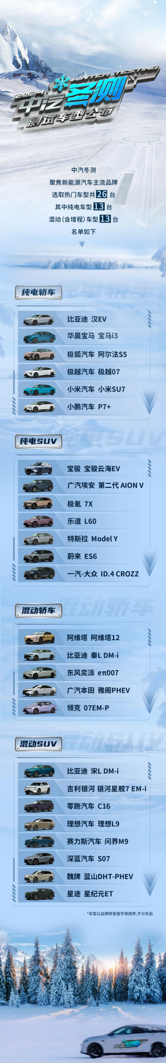 中汽冬測在車型選擇范圍上展現出了廣泛的包容性,此次測試聚焦新能源汽車主流品牌,精心選取熱門車型共26臺,其中純電車13臺,混動(含增程)車型13臺,包括市場上熱門的比亞迪 漢EV、小米SU7、特斯拉 Model Y、阿維塔12、問界M9、深藍汽車S07等。這些新能源車型涵蓋了市場上的主流選擇,它們代表著不同技術路線和品牌特色,對其在極寒環境下性能的深入測試,有助于挖掘新能源汽車在極端條件下的表現,推動新能源技術的不斷發展與完善。