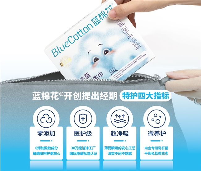 除了調整尺寸外,藍棉花還進行了多個產品迭代計劃內的大升級,其中包括改善護翼大小和長度、改善吸收芯體等,以及在原本含有私處有益菌的產品基礎上,增加雙菌種,進一步呵護女性在月經期間的私處微生態,并同時起到抑菌和祛異味的作用。