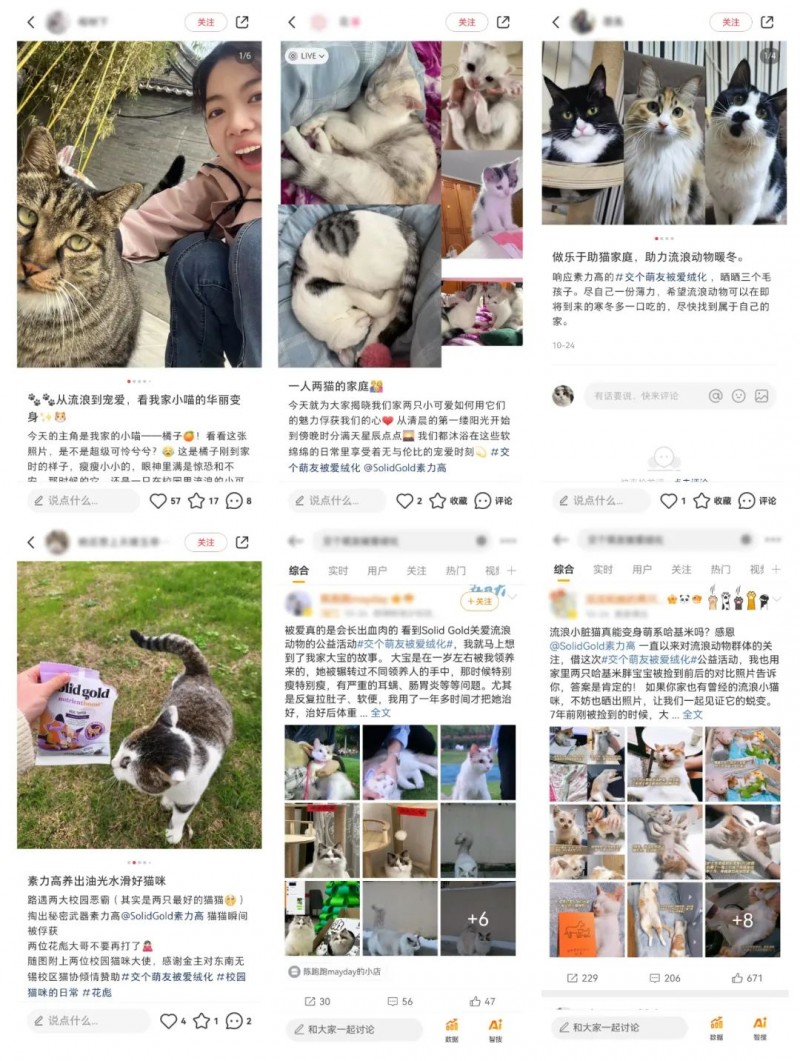 流浪動物救助行動沉重且耗時耗力,為了降低參與門檻,Solid Gold 素力高借助互聯網在線上發起公益捐贈行動,參與者帶話題 #交個萌友被愛絨化# 發布寵物照片至社交平臺,即可為流浪貓捐贈 30g 貓糧,將這份愛心轉化為實體的寵糧,為許多素未謀面的生命送去一頓頓飽餐,同時將公益善舉可視化,加劇流量的轉化,實現活動的引爆。