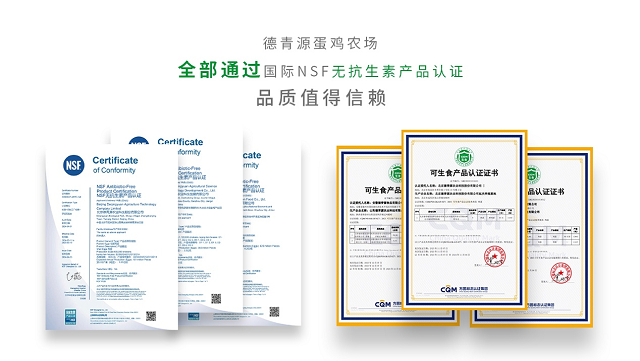 德青源在養殖方面,始終堅持“科學飼喂、健康管理”的高標準,采用純天然飼料,德青源金牌初產可生食鮮雞蛋在專業配方飼養和嚴苛生產標準的基礎上,通過了NSF無抗生素認證和CQM可生食認證,從雞的種源、雞舍衛生、飼料飲水等方面進行嚴格檢測,雞媽媽們在健康、干凈、無抗生素的環境中生活,從源頭上確保雞蛋的安全與營養。