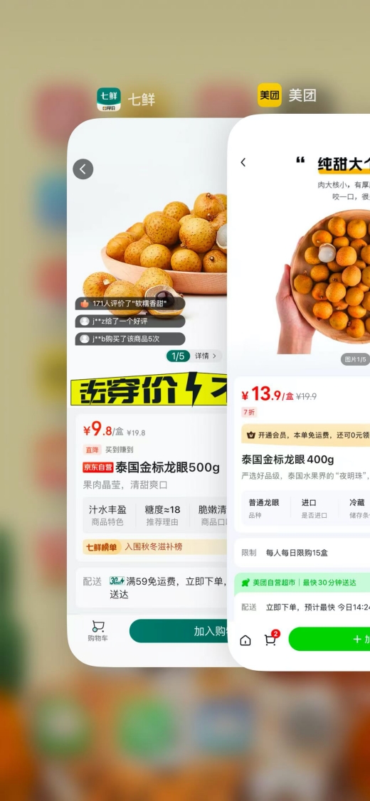 在生鮮品類上京東七鮮同樣具有價格優勢。500克泰國金標龍眼京東七鮮擊穿價為9.8元,在美團小象400克的同款商品售價為13.9元。