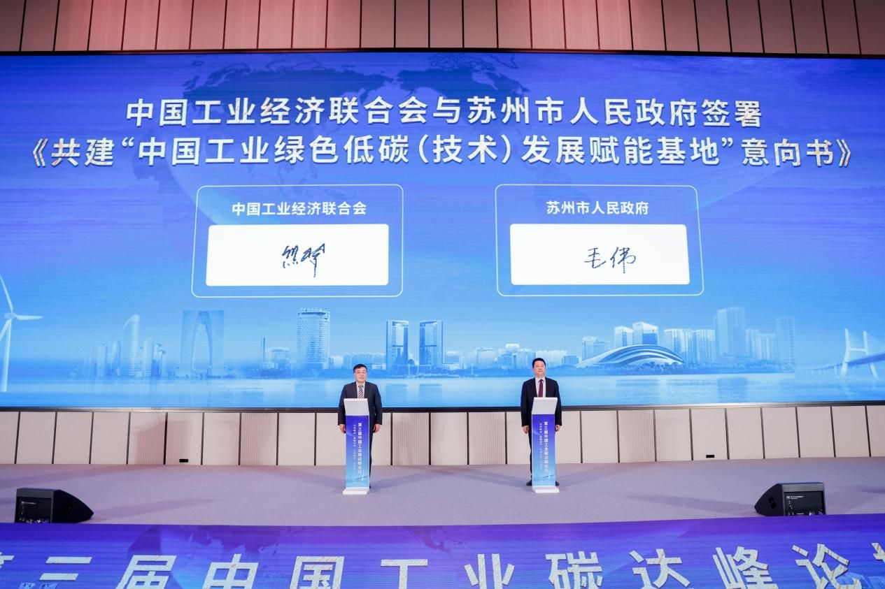 論壇上,中國工經聯黨委書記、執行副會長兼秘書長熊夢和蘇州市副市長毛偉代表中國工經聯和蘇州市人民政府共同簽署了《共建“中國工業綠色低碳(技術)發展賦能基地”合作意向書》。基地將依托蘇州市豐富多元的產業基礎,以及中國工業碳達峰“領跑者”企業的綠色技術、產品和整體解決方案,以需求為導向,共同在長三角地區打造工業綠色低碳發展的新高地。