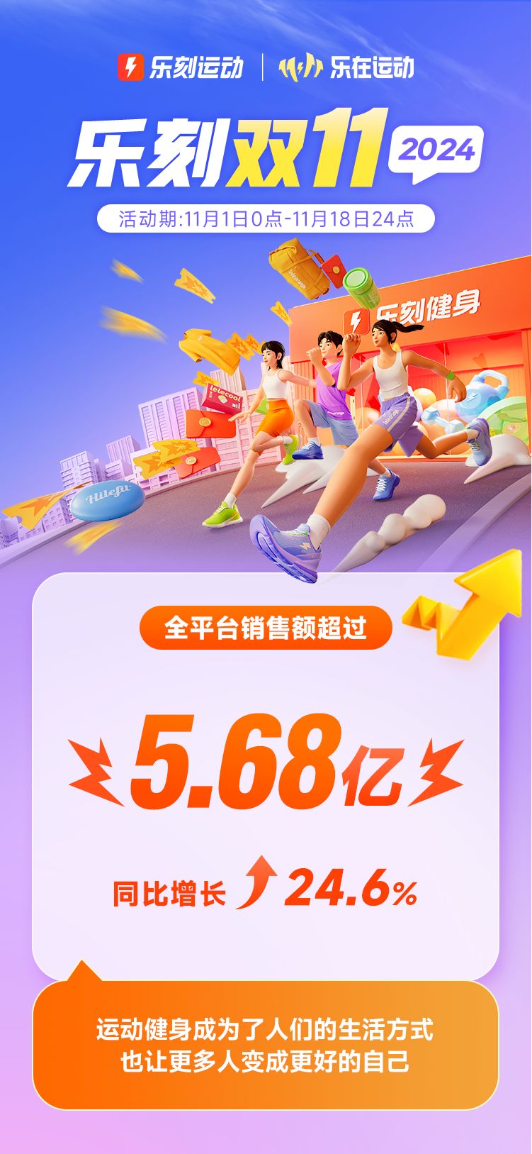 11月18日24點,樂刻2024年“雙11”(活動期11月1日00:00-11月18日24:00)正式收官,全平臺銷售額超過5.68億元,同比增長24.6%,私教購買用戶數同比增長21.6%。在大健康背景下,運動健身已經成為越來越多人的生活方式,樂刻門店規模形成的用戶信賴、高性價比、便捷性以及密集的門店分布,滿足了人們在快節奏生活里隨時隨地動一動的愿望。