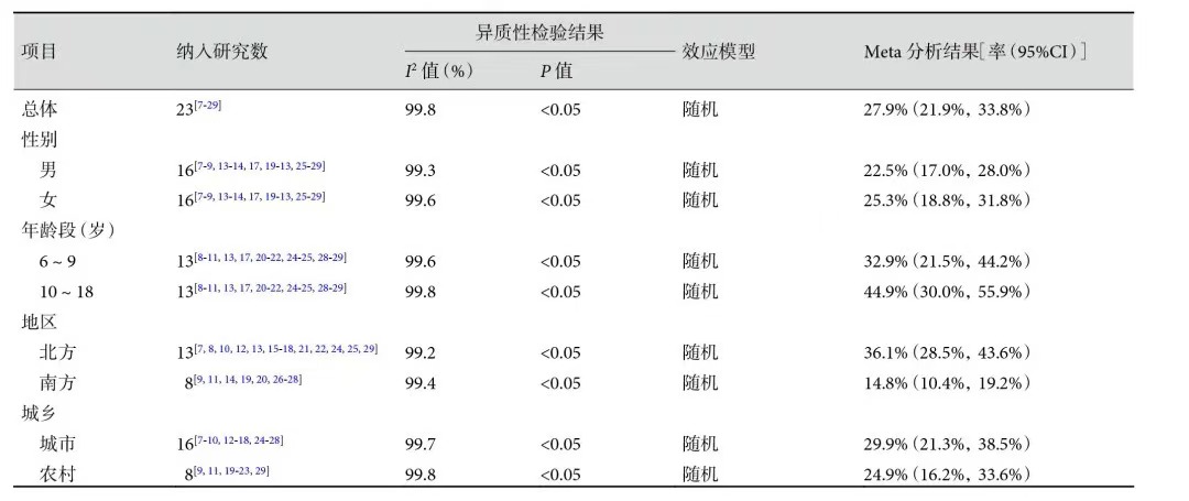 根據張浩等在 2020 年進行的中國兒童青少年維生素 D 營養狀況 Meta 分析,覆蓋 CNKI、WanFang Data、VIP、CBM 和 PubMed 等數據庫,納入 23 個橫斷面調查,總樣本量為 38,047 人,Meta 分析結果顯示,中國兒童青少年維生素 D 缺乏率為 27.9%,不足率為 31.6%。亞組分析結果顯示,女孩維生素 D 缺乏率高于男孩,10~18 歲兒童青少年維生素 D 缺乏率高于 6~9 歲,北方兒童青少年維生素 D 缺乏率明顯高于南方,城市兒童青少年維生素 D 缺乏率略高于農村。
