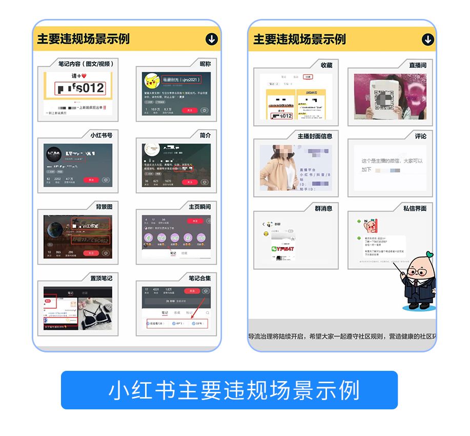 本次小紅書平臺公告內容中,對于違規引流行為進行了詳細定義和示例,不論是通過圖文筆記、昵稱、簡介、主頁瞬間、過往合集等行為展示手機號/微信號,都會被平臺定義為違規引流,受到限流/封號等懲罰。