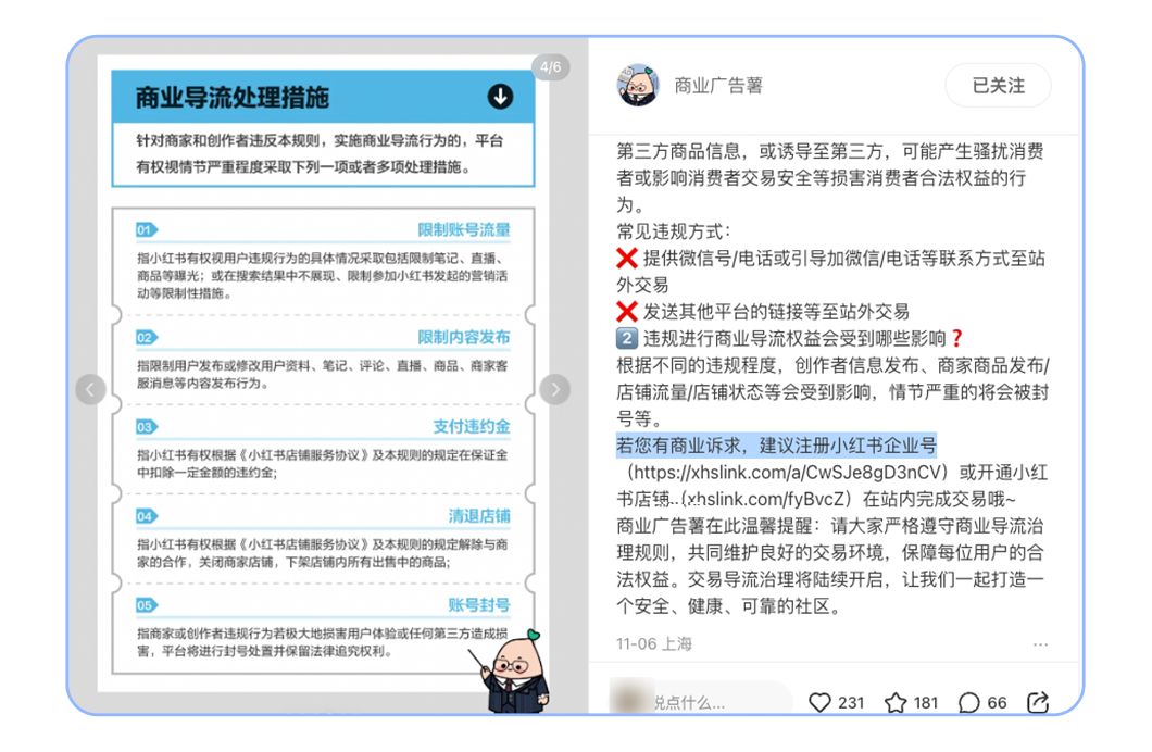 11月6日,小紅書重磅發布了《交易導流商業秩序治理規則公告》,其中明確指出:對于提供微信號/電話或引導加微信/電話等聯系方式到站外交易,以及發送其他平臺的鏈接等至站外交易,均屬于違規行為。根據不同的違規程度,創作者信息發布、商家商品發布/店鋪流量/店鋪狀態等會受到影響,情節嚴重的將會被封號等。