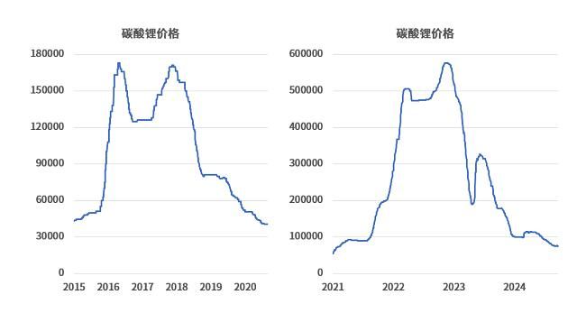 除了價格振幅更大,2020~2024年的這一輪鋰價升降周期,與2015年到2020年的大走勢如出一轍:平穩上漲、快速突破歷史高位、緩慢下降,直至下一次上漲。