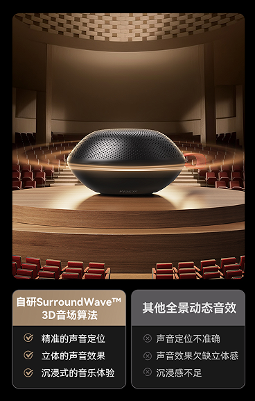 除了卓越音質之外,更在人性化智能設計方面展現了獨特的優勢,音響采用了自主研發的SurroundWave 3D音場算法技術,這一技術通過對音頻各個點位的頻率和特性進行深入分析,精確計算出聲音的定位、距離和角度,從而實現對聲源位置的精準模擬。無論是觀看電影、玩游戲還是欣賞音樂,用戶都能感受到仿佛置身于音樂會現場的真實感。