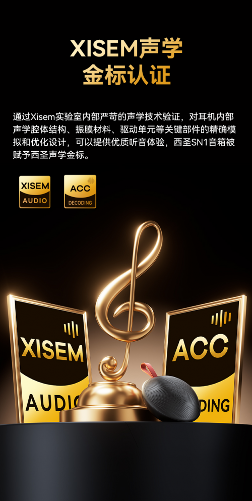 西圣SN01藍牙音箱經過Xisem實驗室嚴格的聲學技術驗證,精心優化了音箱內部的腔體結構、振膜材料和驅動單元等核心組件。正是這種專業級的打磨,才讓它帶來了出色的音質表現,成功獲得了“西圣聲學金標”的認可!