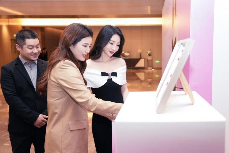 簽約儀式現場,瞧享品牌標志性的瞧享粉遍布整個會場,營造出時尚浪漫的氛圍氣息。柳巖女士更是現身活動現場并參與打卡,為瞧享品牌升級助力!