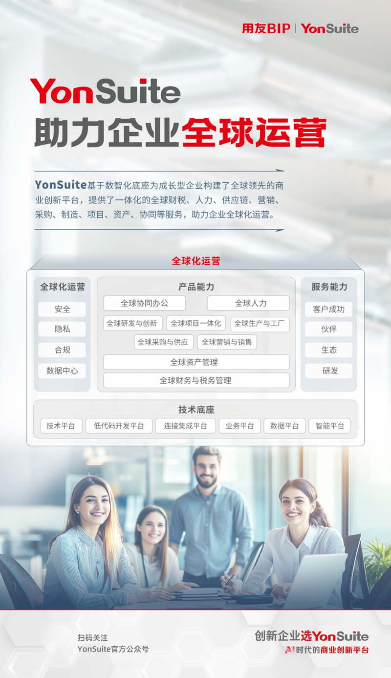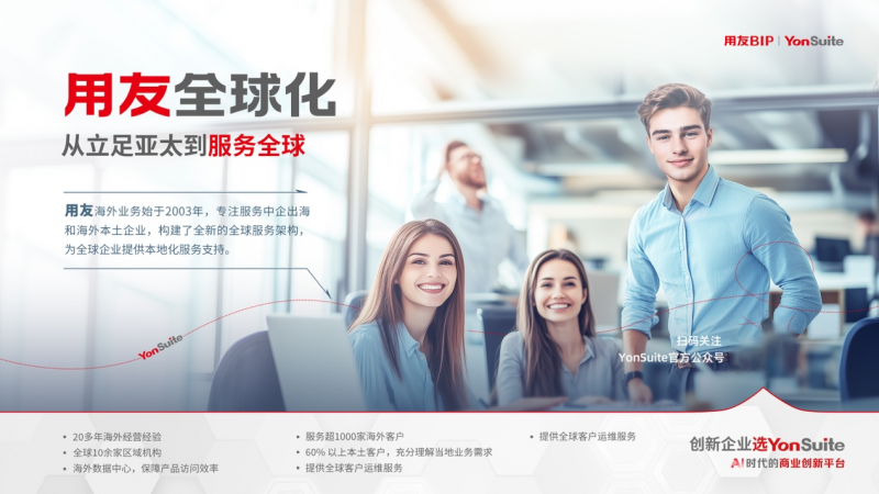 作為中國企業數智化轉型的先行者,用友始終站在全球化浪潮的前沿。通過持續創新和全球化布局,構建了以用友YonSuite和用友BIP為核心的全球化產品矩陣,為全球企業提供了全生命周期、全階段的數智化轉型陪伴式成長服務。