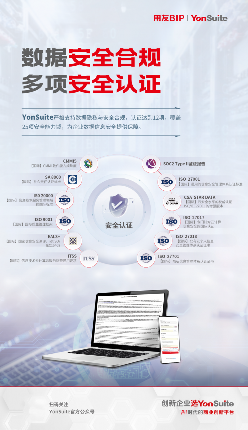 數智化工具能夠實時監控各地政策變化,并提供合規性建議。例如,作為一款擁有SOC2 Type II鑒證報告的全球化SaaS平臺,YonSuite不僅能滿足企業在全球范圍內的業務需求,還能提供全面的全球數據(數據安全、隱私、法律)合規解決方案,幫助企業在復雜多變的全球商業環境中游刃有余。