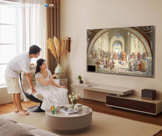 長虹 AI TV:極窄的邊框設計,兩側邊框還采用了東方卷軸畫的設計元素,非常有中式美感。在輔以純平超薄機身和0距離貼墻設計,擺在家中完全就是一副驚艷絕倫的古典壁畫,藝術氣質濃郁。