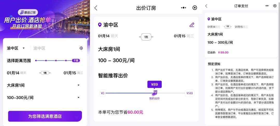 惠選訂房的商業模式,一句話可以概括為:用戶出價酒店搶單的“滴滴模式”。
