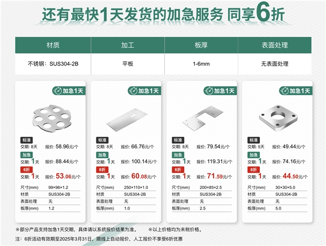 不僅如此,針對部分不銹鋼材質的平板加工,米思米 meviy還有最快1天發貨的加急服務,能很好地解決不少企業的緊急需求!