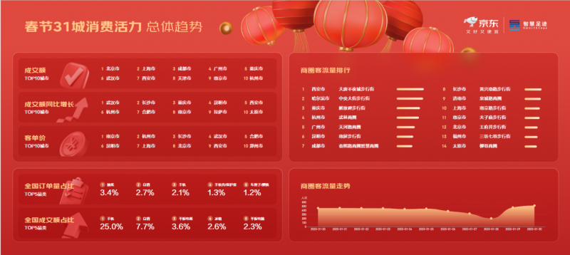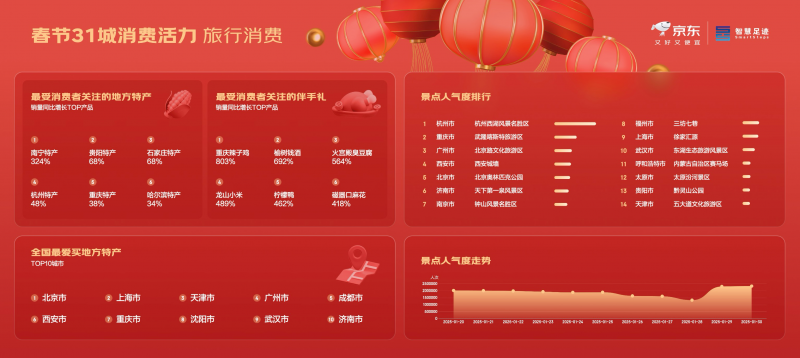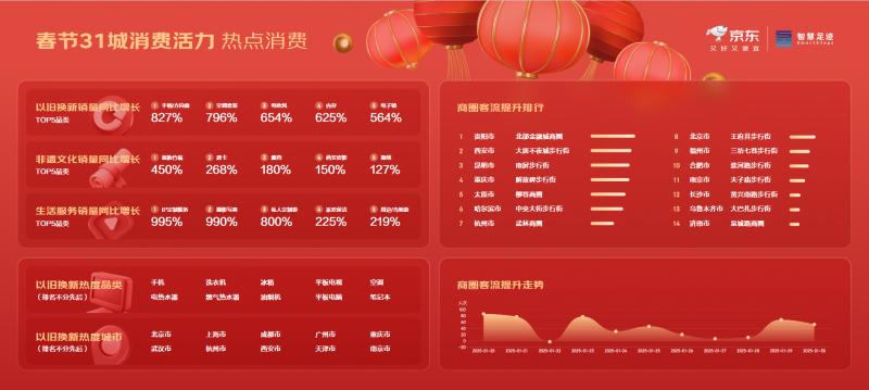 乙巳年春節假期,消費市場持續火熱,線下商圈通過特色場景化消費、生活娛樂消費以及文化體驗消費,吸引了大量消費者,展現了春節消費的多樣性與活力。京東聯合聯通數智智慧足跡,對全國31個城市的線下商圈客流量及消費數據進行了實時動態統計,反映出消費者在春節線上線下各場景中的消費趨勢。