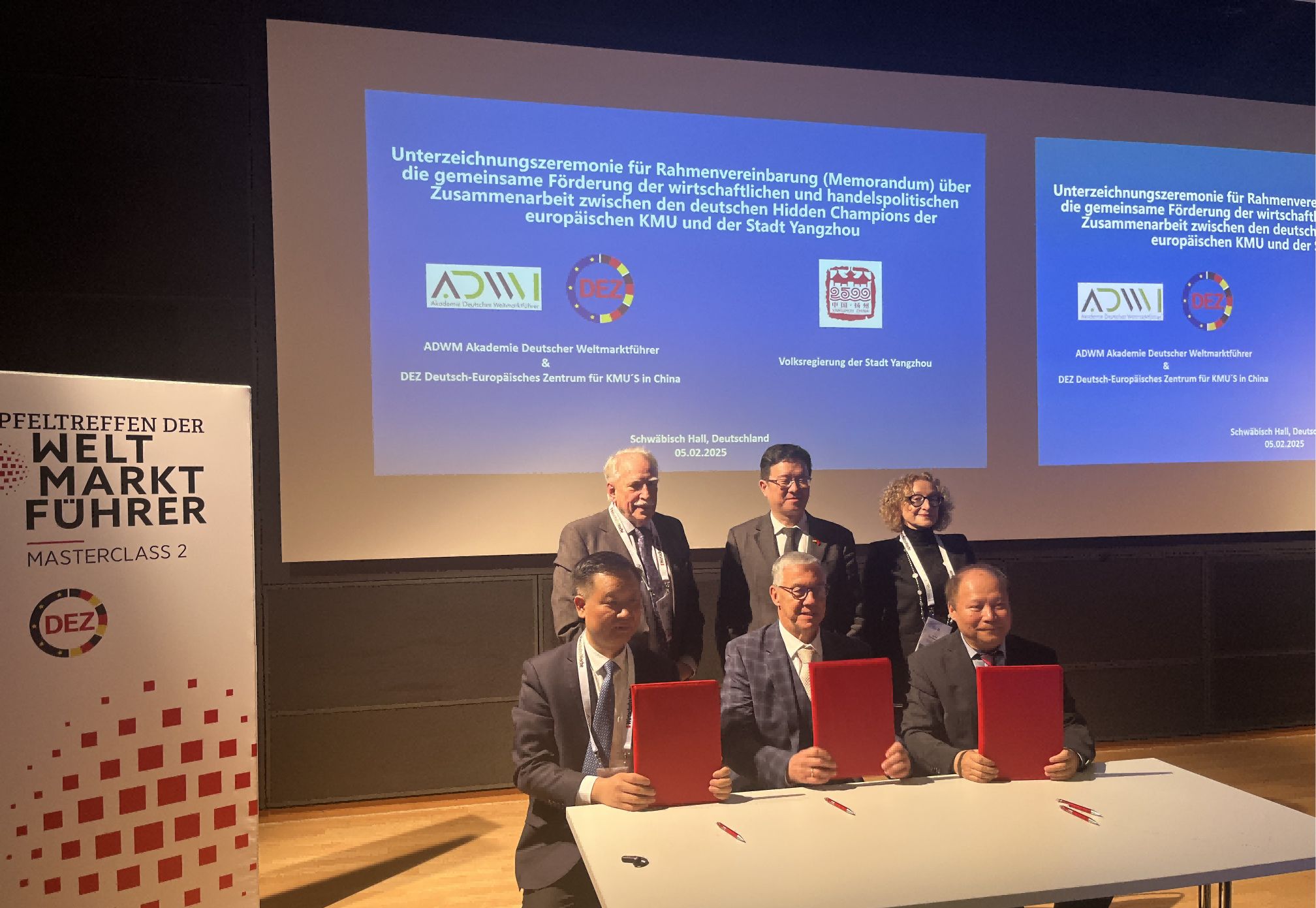 圖9:揚州市市長潘國強與ADWM德國中小企業世界隱形冠軍學會瓦爾特多林主席和DEZ德國歐洲中小企業中國合作中心楊明副主席簽署合作協議(組委會供圖)