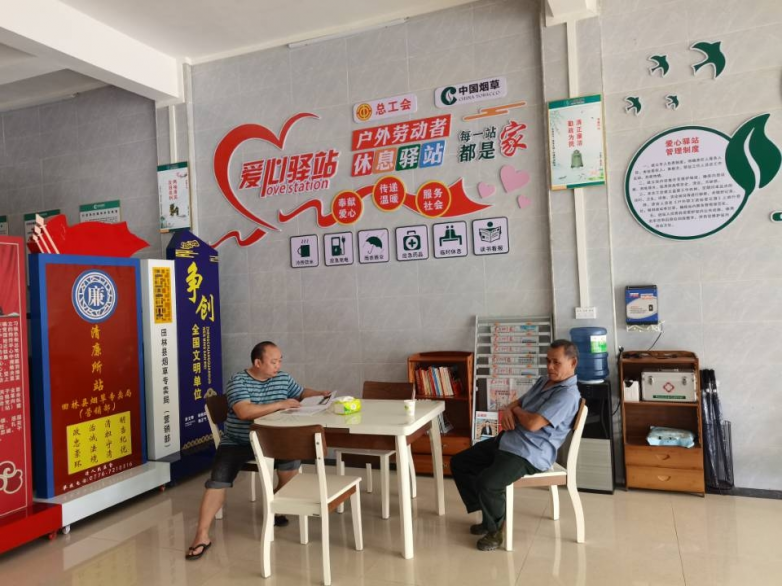 據了解,這個“愛心驛站”位于田林縣八渡鄉煙草專賣所(站)的一樓大廳,占地面積約100平方米。驛站內設有休息區、閱讀區、咨詢服務區等多個功能區域,配備了雨衣雨傘、應急充電、應急藥品、飲水機、微波爐、電動按摩椅、電視等設施,為社區居民和戶外勞動者提供了一個舒適的休息環境。